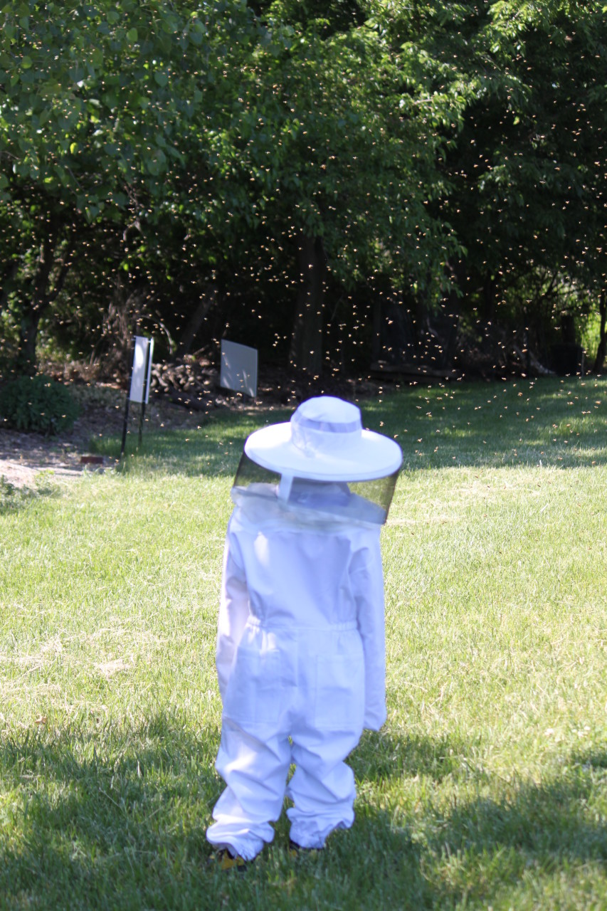 Ensuring your children’s safety around honeybees means you take every necessary precaution to protect them from getting stung. This will require a full body sting proof suit, gloves, and a hat with a veil. You must also exercise good judgement when working the bees with your children around.